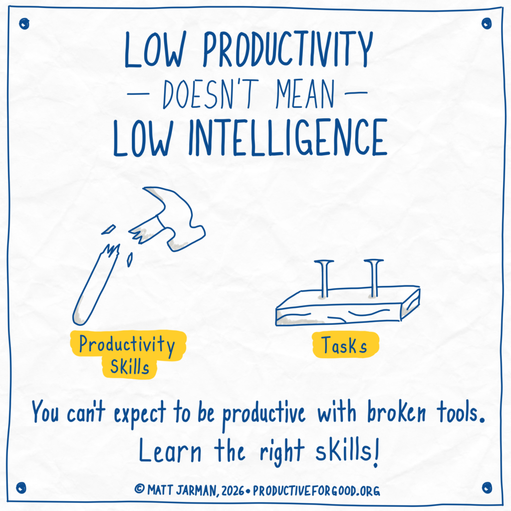 Productivity skills simply depend on your ability to identify which productivity techniques you need, and when. If you’ve never been taught the productivity techniques, how can not using them be a reflection of low intelligence?